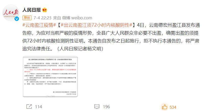 此外,瑞丽市疫情防控工作指挥部决定于7月5日8时起在瑞丽城区、畹町片区范围内开展全员核酸检测。