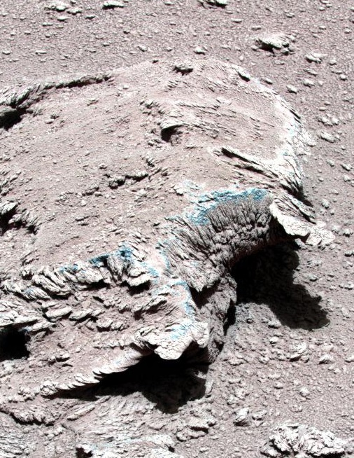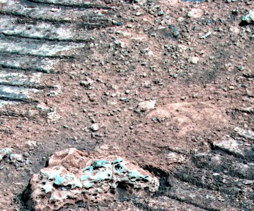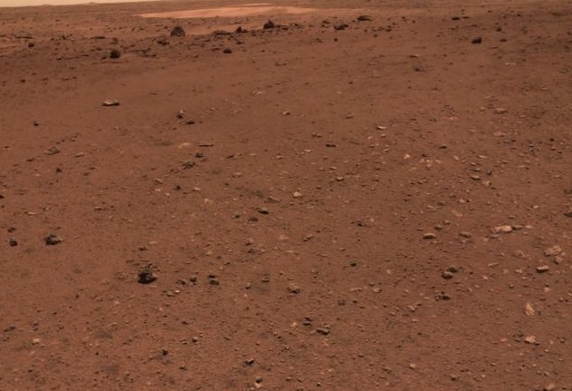 6月26日(第42火星日),火星车到达一处沙丘地带,利用导航地形相机拍摄了红色沙丘高分辨率影像,拍摄点距离沙丘约6米,周围分布有不同大小的石块,其中正对着火星车的石块宽约0.34米。