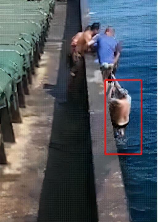 随后,船员向海中扔下救生圈,最终在4名船员的帮助下,老人成功被救上轮船。