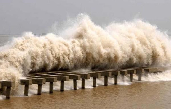 沿海一带常刮东南风,风向与潮水方向大体一致,助长了潮势。