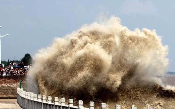 在这里观赏到的是返头潮,此处有一道高9米、长650米的“丁字坝”直插江心,潮水至此,气势已经稍减,但冲到丁字坝头,仍如万头雄狮惊吼跃起,激浪千重。随即潮头转,返窜向塘岸,直向塘顶观潮的人们扑来。