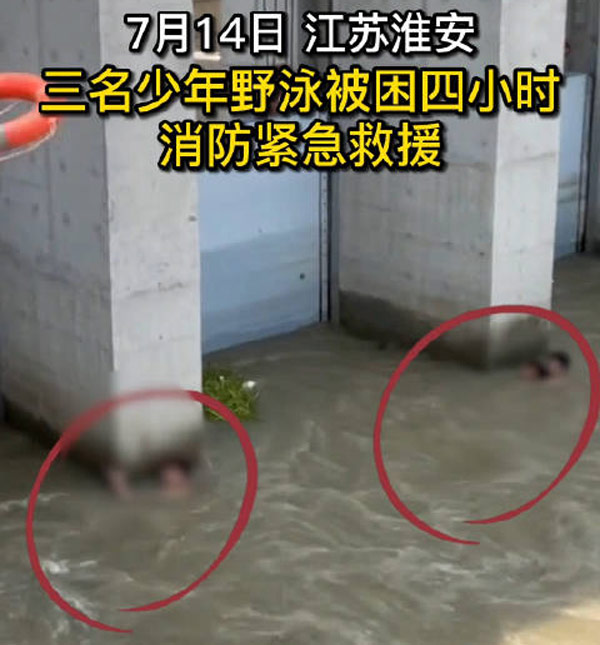 7月14日,江苏淮安,3名14岁左右的少年因天气太热下河游泳。上岸时,一人的鞋子掉落水中,3人返回河中捞鞋,被困河中。3人自救无果,紧抱石柱等待救援,4小时后才被路过市民发现报警。消防随后赶到,将3人救上岸。提醒:游泳应远离野外