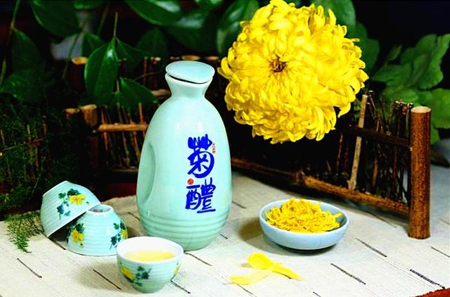 菊花酒:由菊花加糯米、酒曲酿制而成,古称“长寿酒”,其味清凉甜美,有养肝、明目、健脑、延缓衰老等功效。