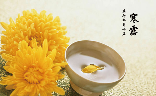 寒露与重阳节接近,此时菊花盛开,为除秋燥,某些地区有饮“菊花酒”的习俗,这一习俗与登高一起,渐渐移至重阳节。菊花酒是由菊花加糯米、酒曲酿制而成,古称“长寿酒”,其味清凉甜美,有养肝、明目、健脑、延缓衰老等功效。