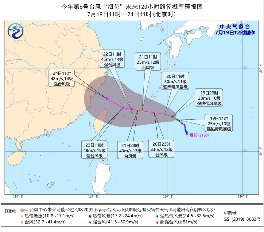 预计,“烟花”将以每小时15-20公里的速度向西偏北方向移动,并将于昨天中午到傍晚在浙江象山到江苏启东一带沿海登陆(台风级,12-13级,33-38米/秒)。登陆后强度逐渐减弱,并有可能在华东地区回旋。