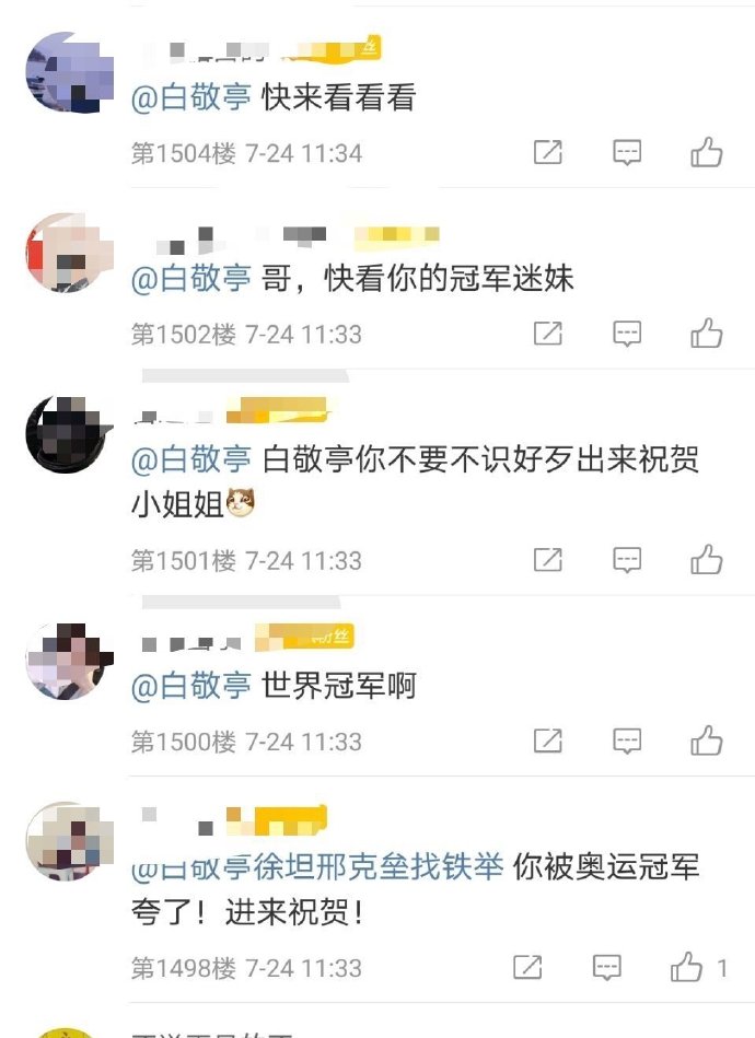 很多网友在白敬亭微博下留言:“你终究是高攀了奥运冠军。”