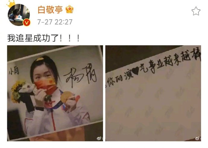 白敬亭还在社交网络晒出杨倩的签名照,杨倩还写下:“祝你的演艺事业越来越棒!”