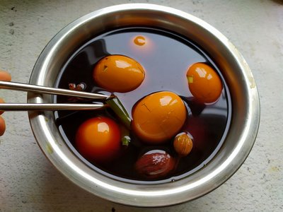 3、煮好放凉的茶叶蛋若需加热,只需将汤汁烧开,熄火后再将蛋放入浸泡即可。