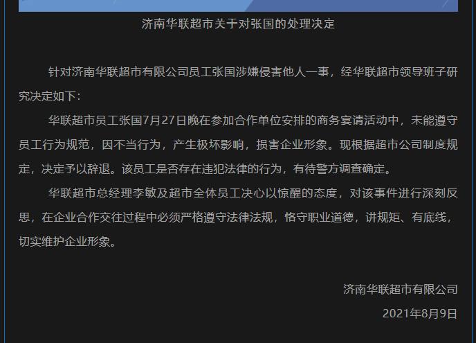 据“济南华联超市”微信公众号8月9日消息,针对济南华联超市有限公司员工张国涉嫌侵害他人一事,经华联超市领导班子研究决定如下: