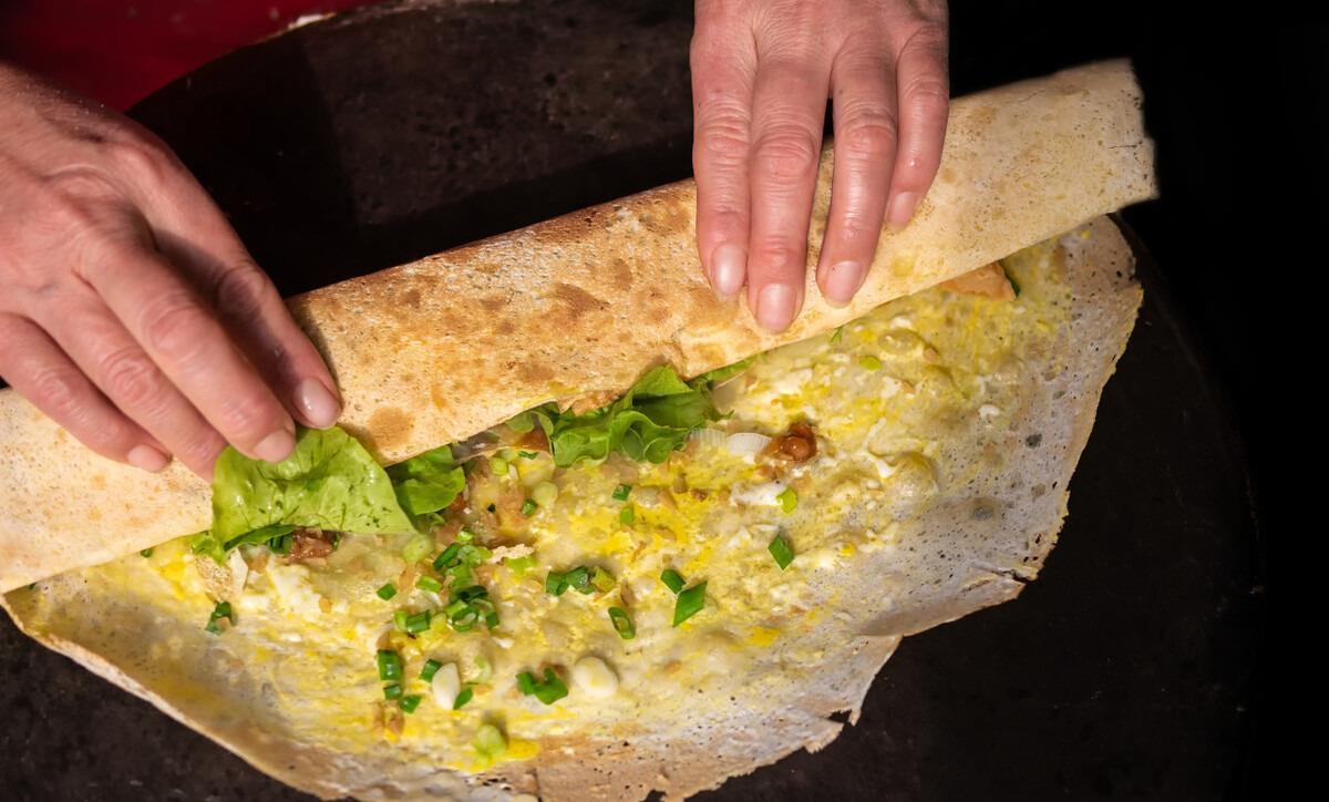 饼摊鸡蛋做法简单,把面糊摊成饼,受热均匀快成型时,将摊好的鸡蛋迅速倒在饼上。饼和鸡蛋固然不错,但缺乏膳食纤维,钾元素和维生素C也不足,要再加凉拌蔬菜来搭配,营养才平衡。所以,吃烙饼时,可以切几片酱牛肉,加些豆腐丝。还可以加点菜进去,放点应季野菜也不错。