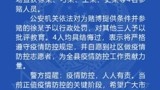 公安机关依法对为赌博提供条件并参赌的徐某予以行政处罚,对其他三人予以批评教育。4人均具结悔过,表示将严格遵守疫情防控规定,并自愿到社区做疫情防控志愿者,为全县疫情防控工作贡献力量。