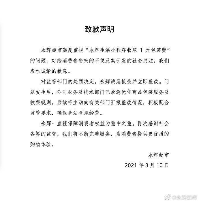 8月10日凌晨,永辉超市股份有限公司官方微博发布声明称,公司高度重视“永辉生活小程序收取1元包装费”的问题,对给消费者带来的不便及其引发的社会关注,表示诚挚歉意。对监管部门的处罚决定,永辉诚恳接受并立即整改。问题发生后,公司业务及技术部门已紧急优化商品包装服务及收费规则。后续将主动向有关部门汇报整改情况,积极配合监管要求,确保合法合规经营。