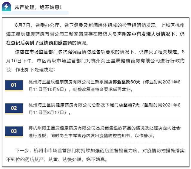 2、杭州海王星辰健康药房有限公司总部及下属门店整顿7天(整顿时间2021年8月11日至8月17日)。