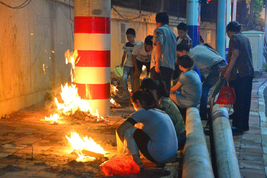 七月中元节、也是月半,鬼节,初七到十五这几天、老人传下来初七到初九这三天是新亡人,,新亡人就是百年还没超过三年,这三天就是祀拜他们烧低,初十到十五这几天就是老亡人,超过三年统称老亡人,祀拜烧收,只在这几天内烧纸拜祀不同,每天可烧。