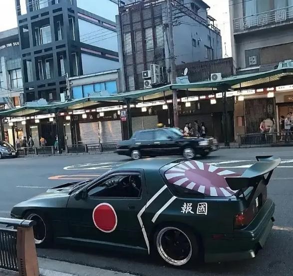 他曾去日本旅游,发了一张有旭日旗图案的零式战机改装车。