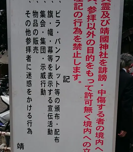 红字翻译:【禁止诽谤、中伤英灵和靖国神社的人进入,禁止怀着参拜以外的目的,未经许可的人进入。禁止左边所示的行为。】