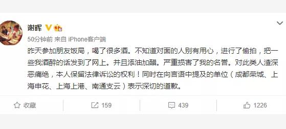谢晖表示:“昨天参加朋友饭局,喝了很多酒。不知道对面的人别有用心,进行了偷拍,把一些我酒醉的话发到了网上。并且添油加醋。严重损害了我的名誉。本人保留法律诉讼的权利!同时在向言语中提及的单位(成都蓉城、上海申花、上海海港、南通支云)表示深切的道歉。”