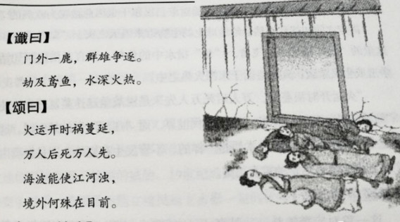 这一象的图画是高墙外地上躺着许多四人,谶语为:“门外一鹿,群雄争逐,劫及鸢鱼,水深火热”,颂语为:“火运开时祸蔓延,万人后死万人先,海波能使一江一河浊,境外何殊在目前”。