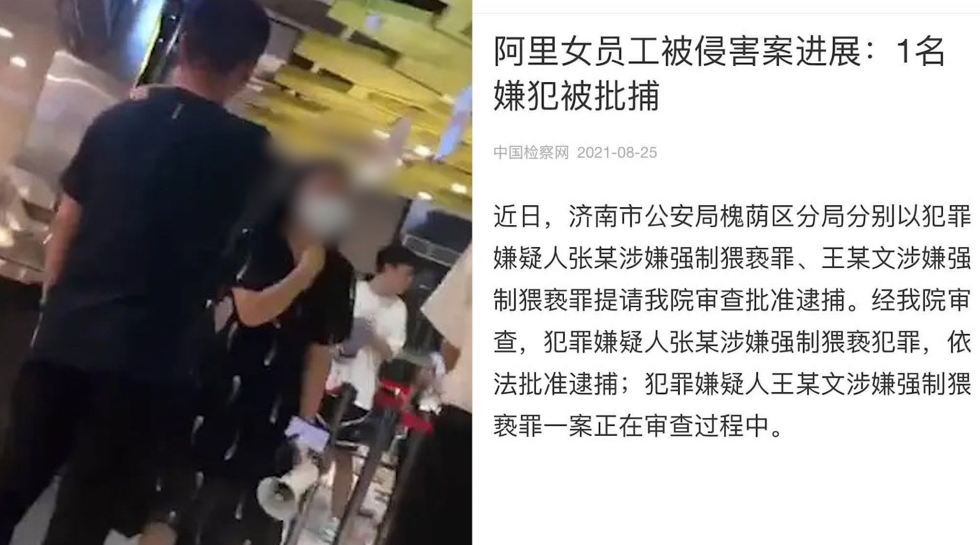 25日,济南市槐荫区人民检察院通报,“阿里女员工被侵害”案1名犯罪嫌疑人被依法批准逮捕。
