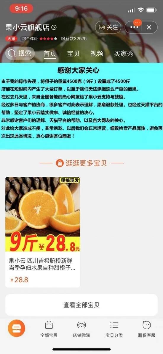 双11将至前夕,一家网上水果店由于店主的操作失误,将“26元买4500克”错设成4500斤。因B站的一名网红主播号召粉丝“薅羊毛”,一晚下了十几万单,在得不到发货后。继续号召粉丝投诉索赔,导致店主赔付保证金被扣光并关店下线。