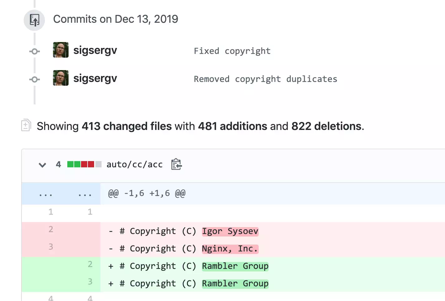 呵呵,想把Copyright从Igor Sysoev改为这次官司的一方Rambler公司,提出这个代码请求的账号是Sergey Stolyarov,在github上个人信息不详,只知道是一个俄罗斯人。