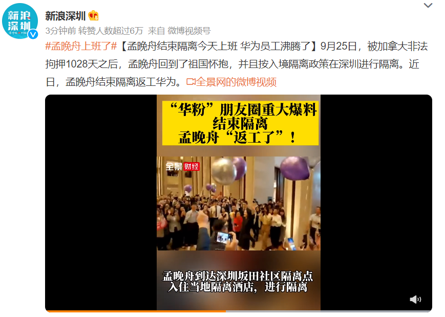 孟晚舟上班了,冲上了热搜,9月25日,被加拿大非法拘押1028天之后,孟晚舟回到了祖国怀抱,并且按入境隔离政策在深圳进行隔离。近日,孟晚舟结束隔离返工华为。 已重新打开正常工作模式,回归到正常的工作和生活状态。孟晚舟回华为上班引起多大轰动?孟晚舟回华为上班,隔离期结束孟晚舟回华为上班了,接下来就和小编来了解一下吧 !