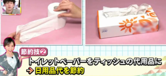 小笠原洋子家中从没买过盒装的纸抽,全都是卷纸。她认为,用纸抽会造成浪费。但是卷纸可控制使用的长度,价格也比纸抽便宜,买一卷用好长时间,更划算。